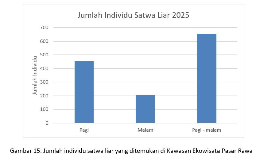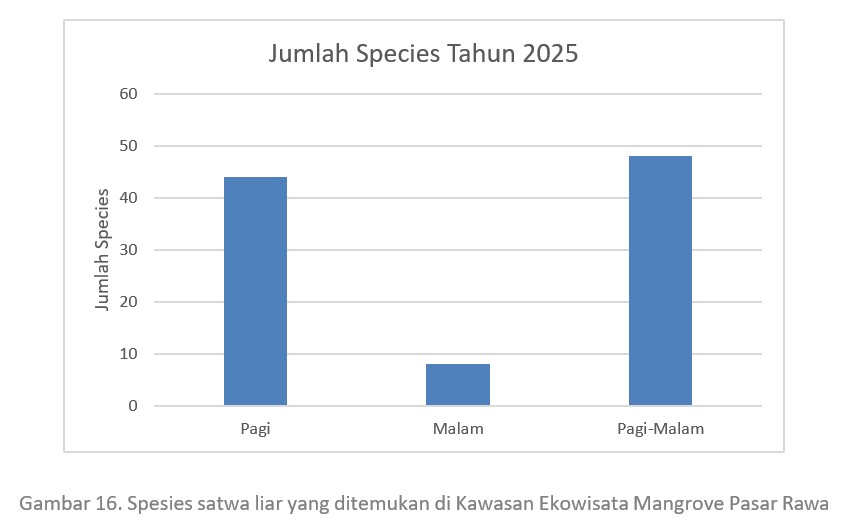 Berdasarkan Gambar 16. maka dapat dijelaskan bahwa spesies yang ditemukan saat pengamatan antara pagi dan malam tidak berbeda jauh. Hal ini merupakan salah satu dampak positif hutan mangrove pasar rawa sebagai habitat bagi 48 species satwa liar yang di temukan pada saat pengamatan.
